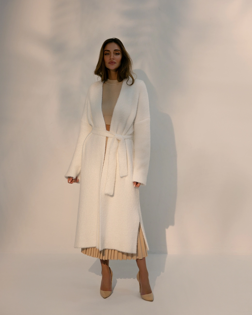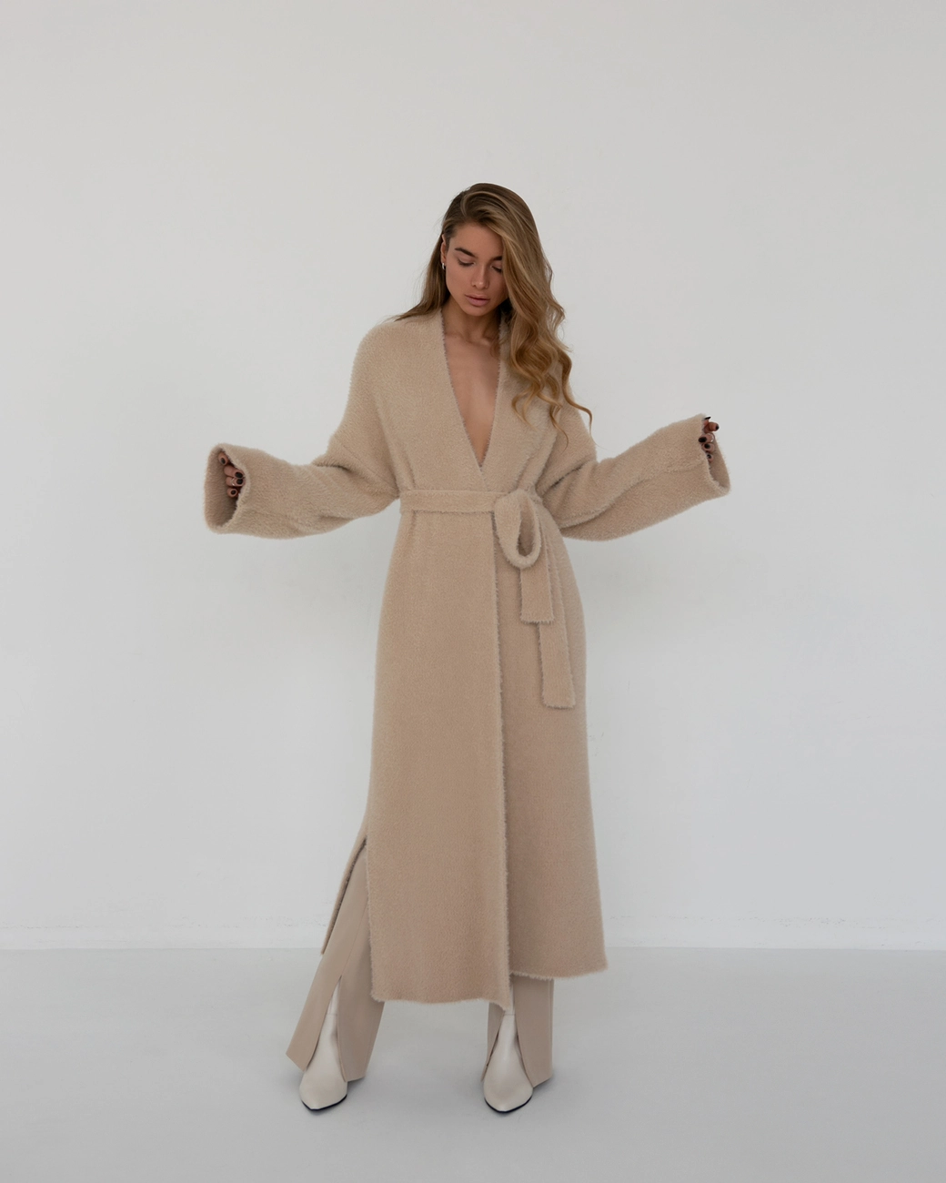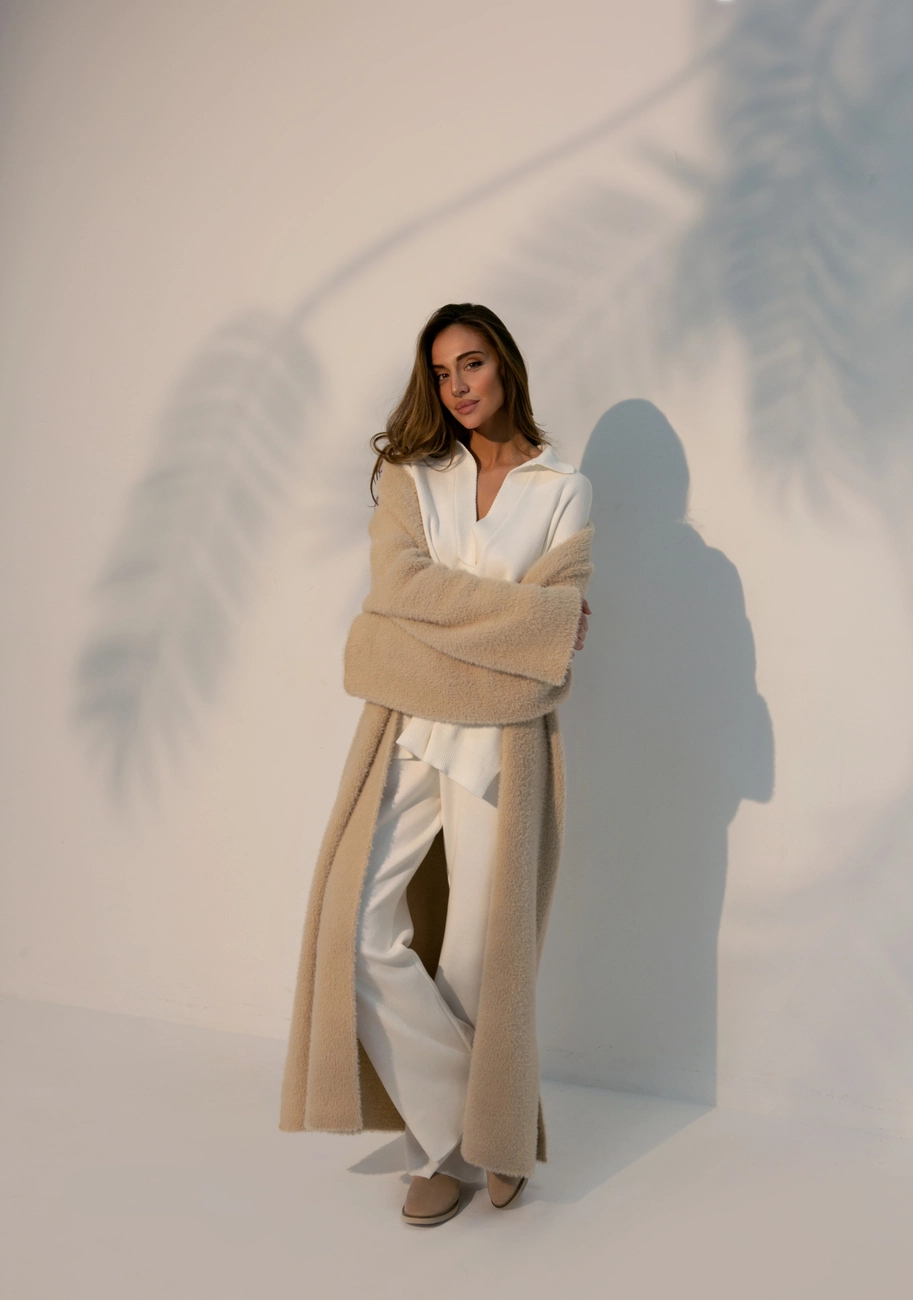 Подовжений кардиган 115 см довжини. Виконаний з м'якої пухнастої пряжі. Кардіган ідеально підійде на прохолодну погоду.