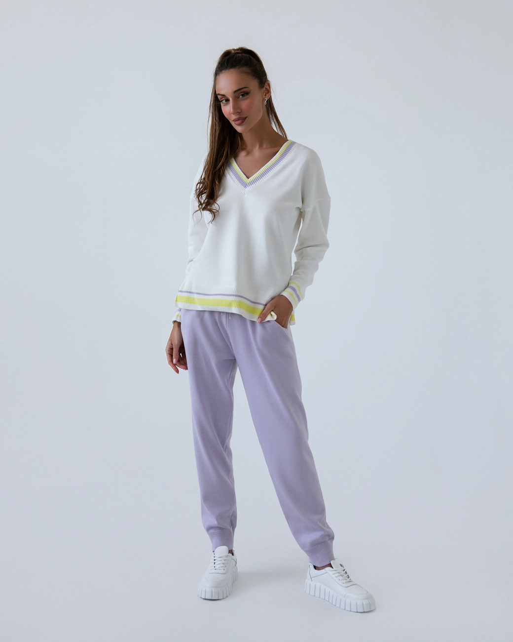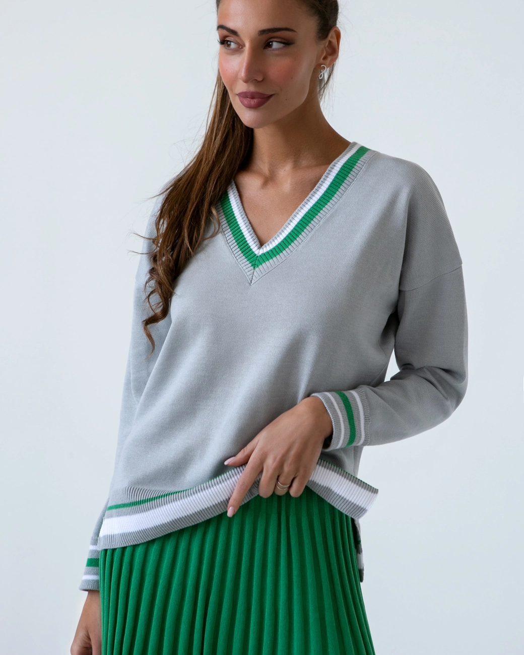 Джемпер з V-подібним вирізом та кольоровими манжетами з ніжної бавовняної нитки. Джемпер комбінується з фірмовими джинсами джоггерами, спідницею пліссе міні або спідницею гофре міді