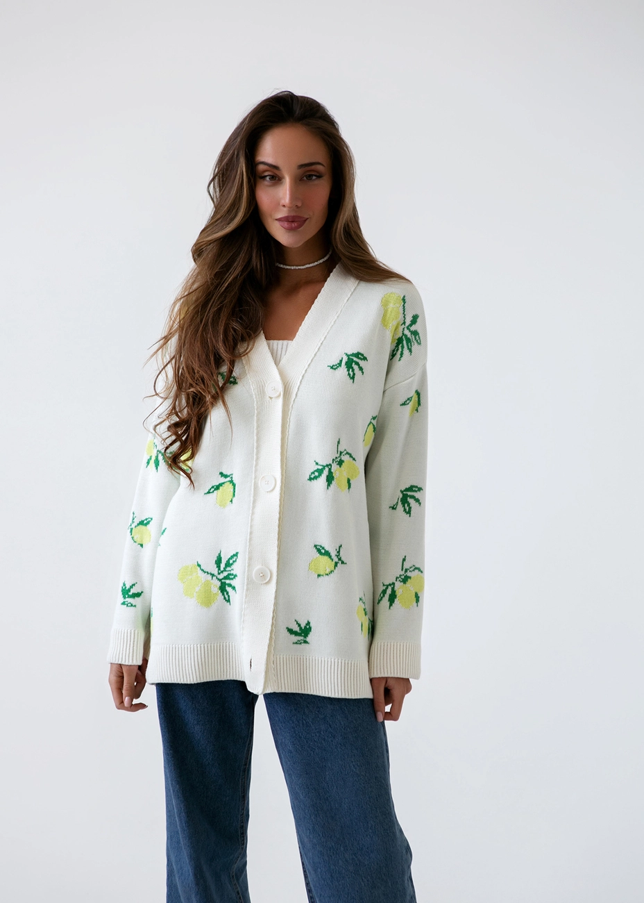 Кардиган із затишного жаккарда з лимонами. Виконаний з натуральної бавовни. Додасть свіжості та краси будь-якому образу. Комбінується зі штанями джоггерами, силуетною сукнею або спідницею гофре міді.
