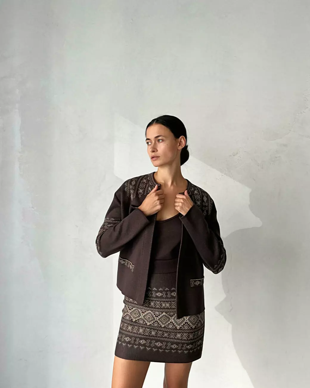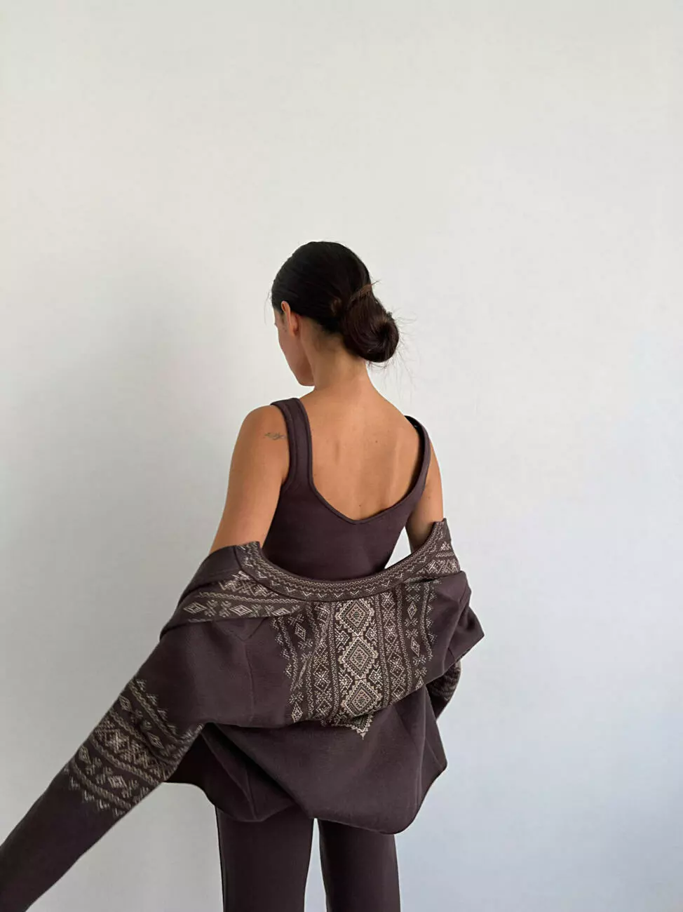 Жакет з українською вишивкою на рукавах та спині, що символізує незламність та силу нашого народу. Стильний, сучасний та автентичний жакет, який говорить краще за слова. Поєднується в комплекті зі спідницею та штанами дропу Сила поколінь